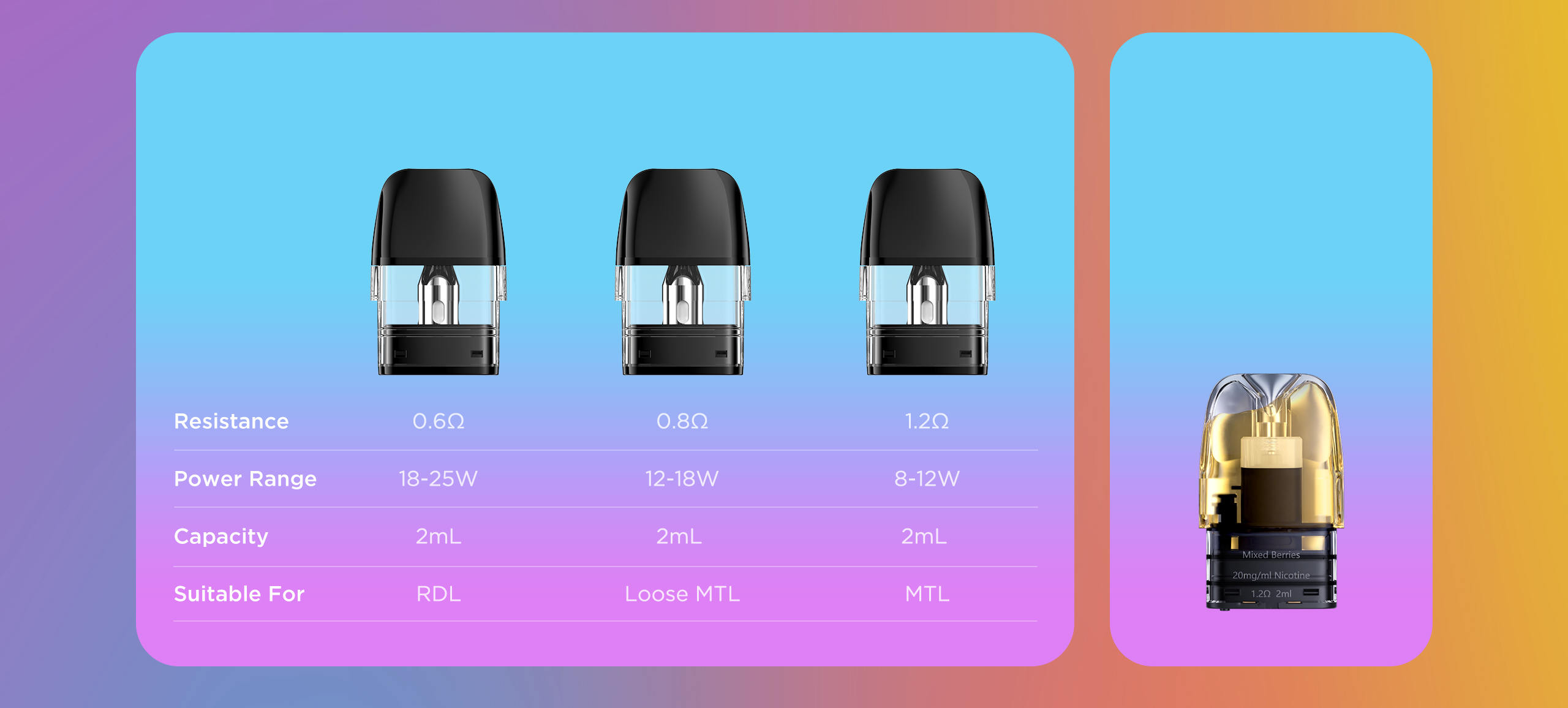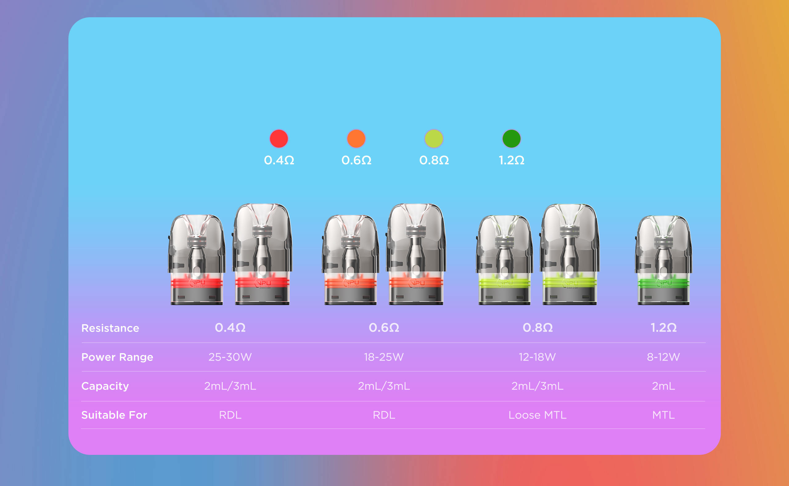 Pod Resistance Supported: 0.4Ω/0.6Ω/0.8Ω/1.2Ω